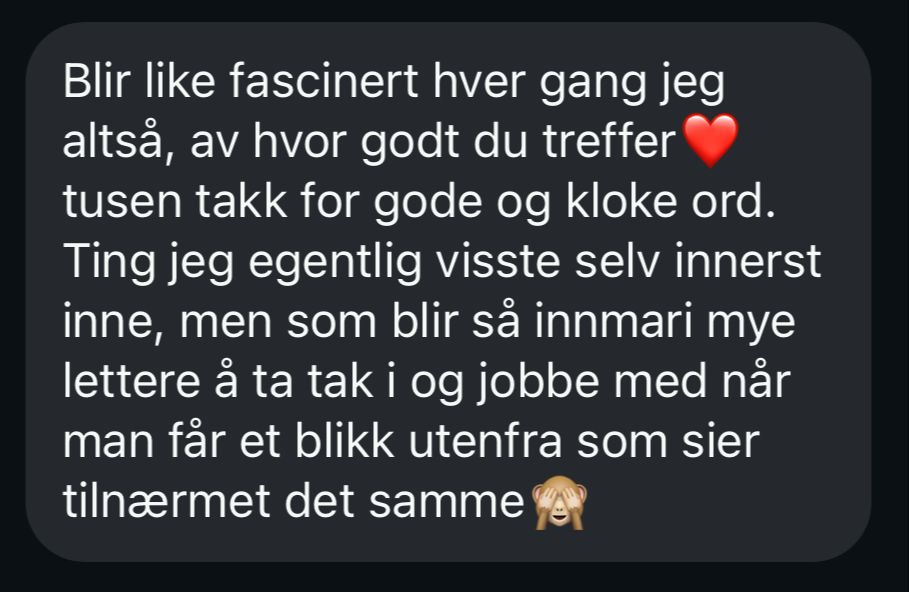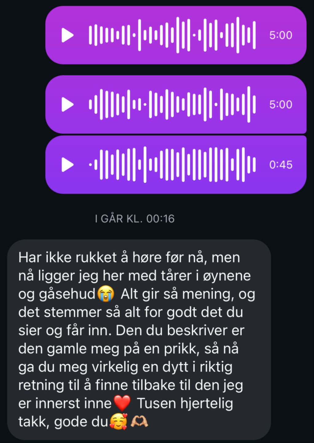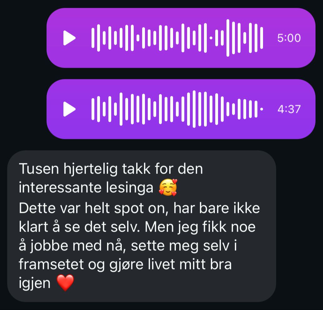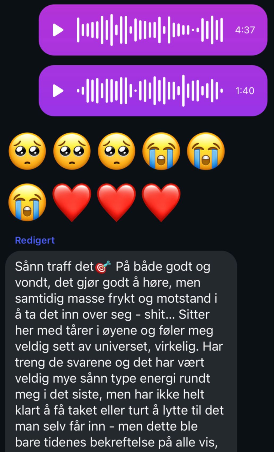 I min prosess har jeg oppdaget at min egen intuisjon er ekstremt sterk, og at jeg treffer spikeren midt på hodet når jeg bare lytter til den. Rundt 50 kvinner (og et par menn) har mottatt lesinger fra meg de siste månedene og tilbakemeldingene snakker for seg selv.