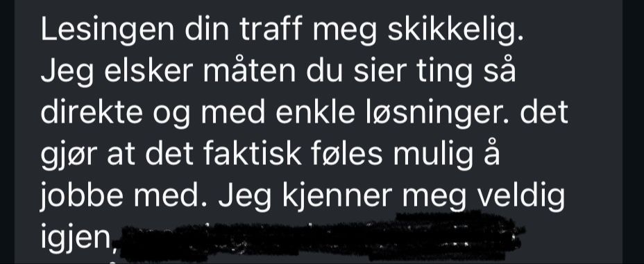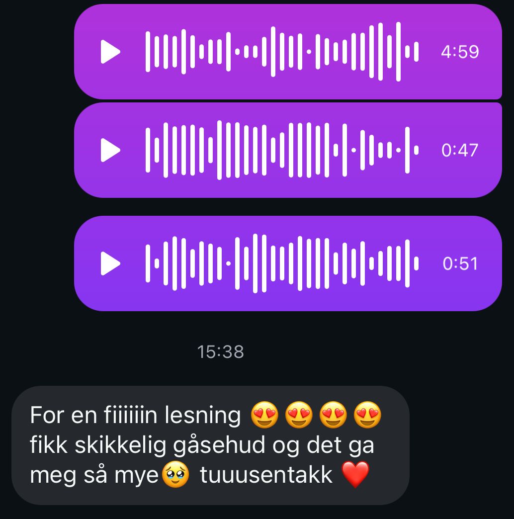 I den står det at du skal sende meg en melding på Instagram eller Facebook (der du kjenner meg fra), der du forteller meg at du har booket en lesing, og hvilke(t) tema(er) du ønsker det skal handle om. Har du booket Fokuspunkt så gir du meg ett tema. Har du valgt Dypdykk så gir du meg opptil tre temaer.